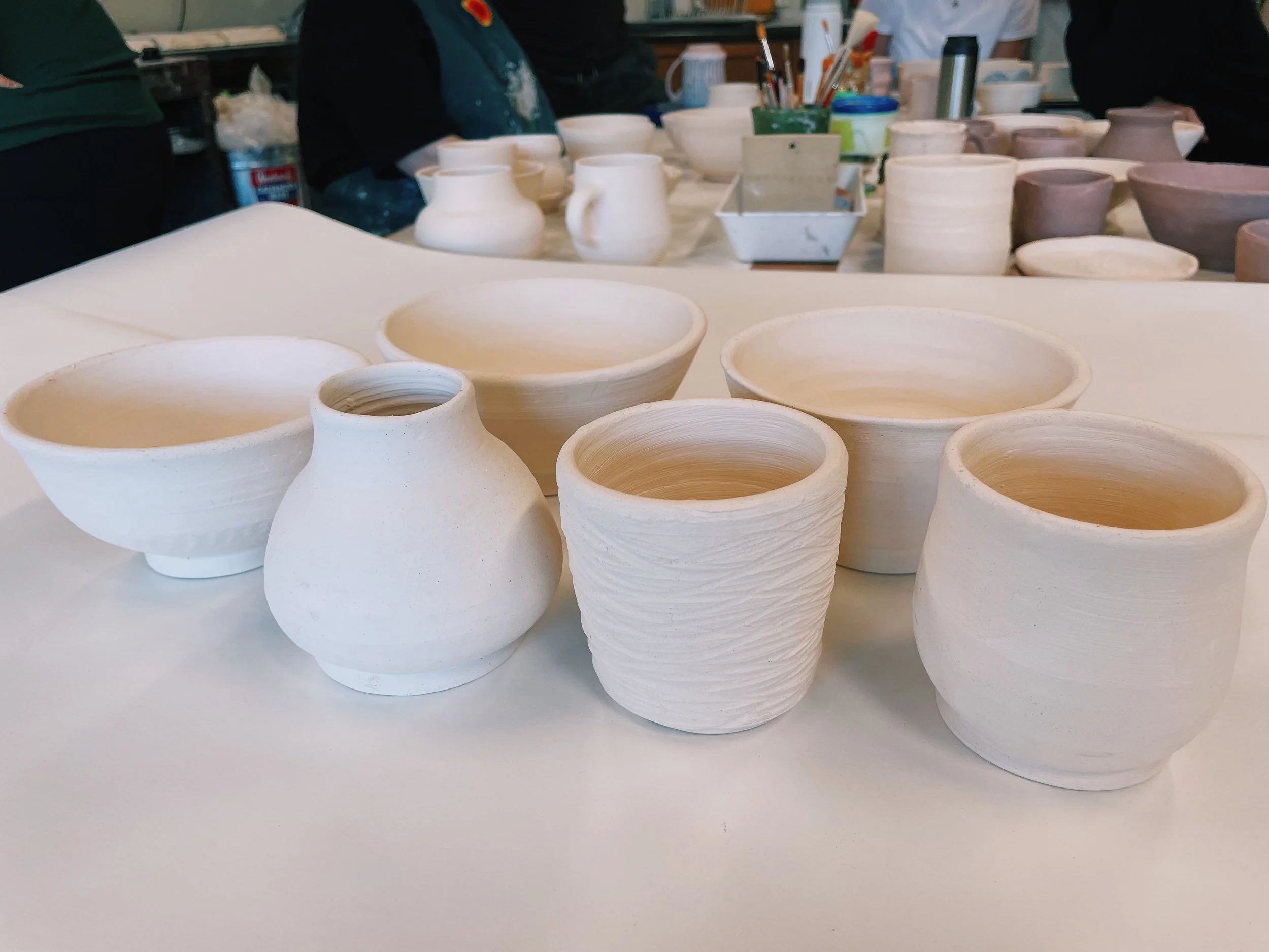 Some pieces that just got bisque fired. Bisque firing transforms the object into a porous state for glazing and also reduces the chances that the piece will crack when glaze fired because the kiln is brought to temperature a lot more gradually during this stage.